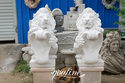 This marble lion with shield statue is uniquely designed and lifelike. The artisans of YouFine factory carve it by hand. We use pure natural marble when carving. Marble made of it could have a long service life. Such a white marble lion statue placed at the door of the house is like a guardian of the family, bringing you peace. At the same time, the lion statue is also a symbol of power and status, which could demonstrate your noble taste.